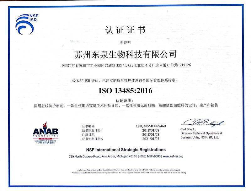 1. 企業(yè)經(jīng)NSF-ISR評(píng)估,已建立的質(zhì)量管理體系符合國(guó)際管理體系標(biāo)準(zhǔn),于2018年1月8日獲《ISO13485:2016認(rèn)證證書(shū)》 。