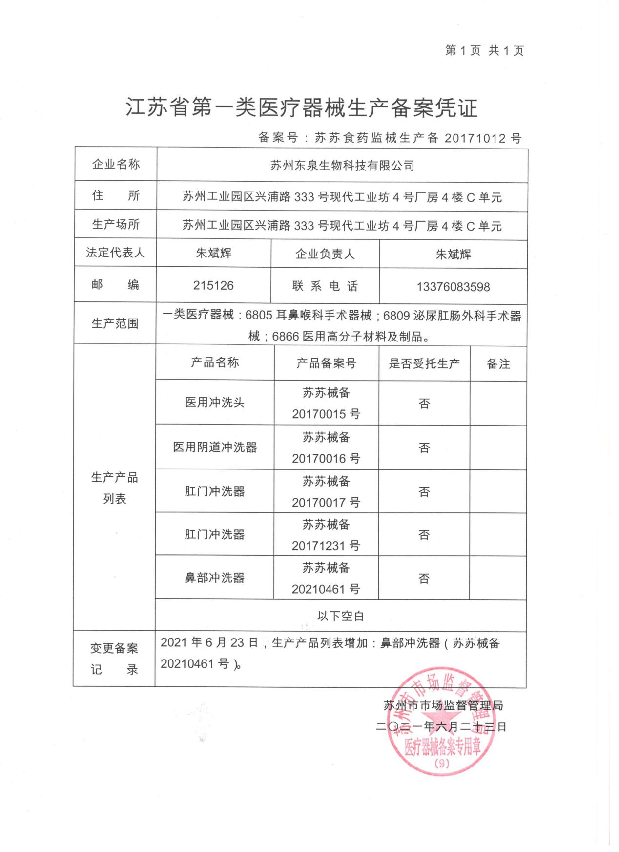 江蘇省第一類(lèi)醫(yī)療器械生產(chǎn)備案憑證